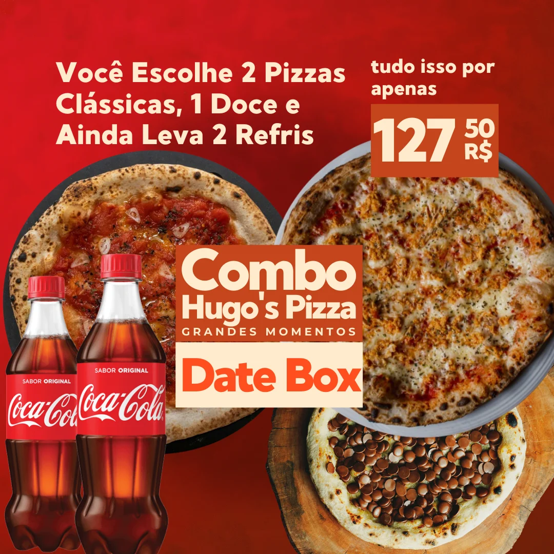 O Combo Hugo's Pizza Para Grandes Momentos traz a você a oportunidade de saborear uma variedade de sabores. Este pacote inclui quatro Pizzas Clássicas, cuidadosamente preparadas com ingredientes de alta qualidade, proporcionando uma experiência gastronômica inesquecível. Além disso, o combo oferece uma Pizza Doce, uma indulgência perfeita para satisfazer seu paladar doce. Para completar, dois refris gelados acompanham este magnífico combo, proporcionando a hidratação necessária e complementando perfeitamente a refeição. A Hugo's Pizza Party Box é a escolha perfeita para grandes momentos de celebração e diversão!