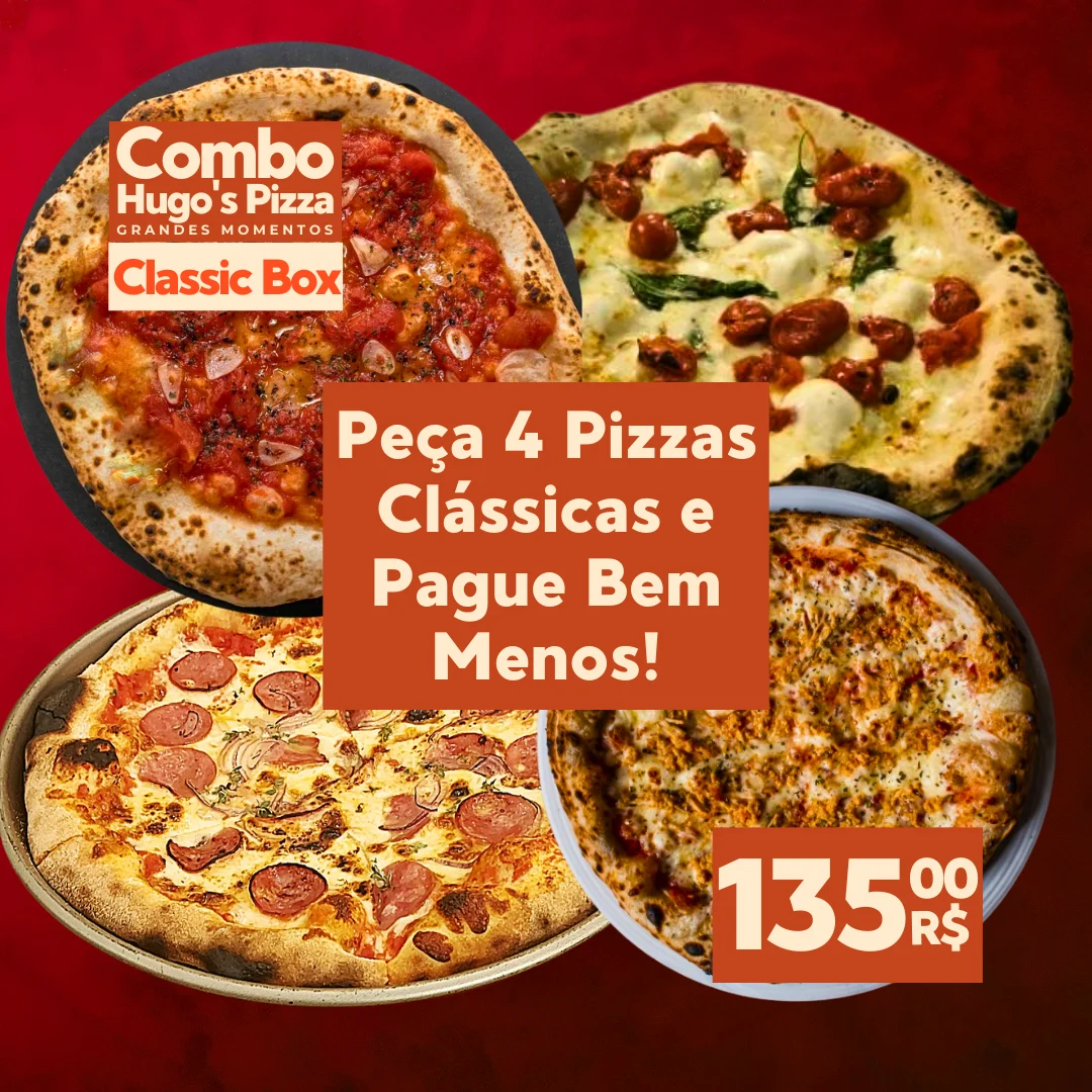 O Combo Hugo's Pizza Para Grandes Momentos traz a você a oportunidade de saborear uma variedade de sabores. Este pacote inclui quatro Pizzas Clássicas, cuidadosamente preparadas com ingredientes de alta qualidade, proporcionando uma experiência gastronômica inesquecível. A Hugo's Pizza Party Box é a escolha perfeita para grandes momentos de celebração e diversão!