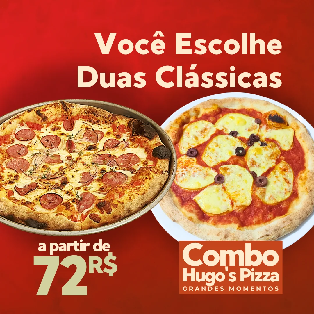O Combo Hugo's Pizza Para Grandes Momentos traz a você a oportunidade de saborear uma variedade de sabores. Este pacote inclui quatro Pizzas Clássicas, cuidadosamente preparadas com ingredientes de alta qualidade, proporcionando uma experiência gastronômica inesquecível. A Hugo's Pizza Party Box é a escolha perfeita para grandes momentos de celebração e diversão!